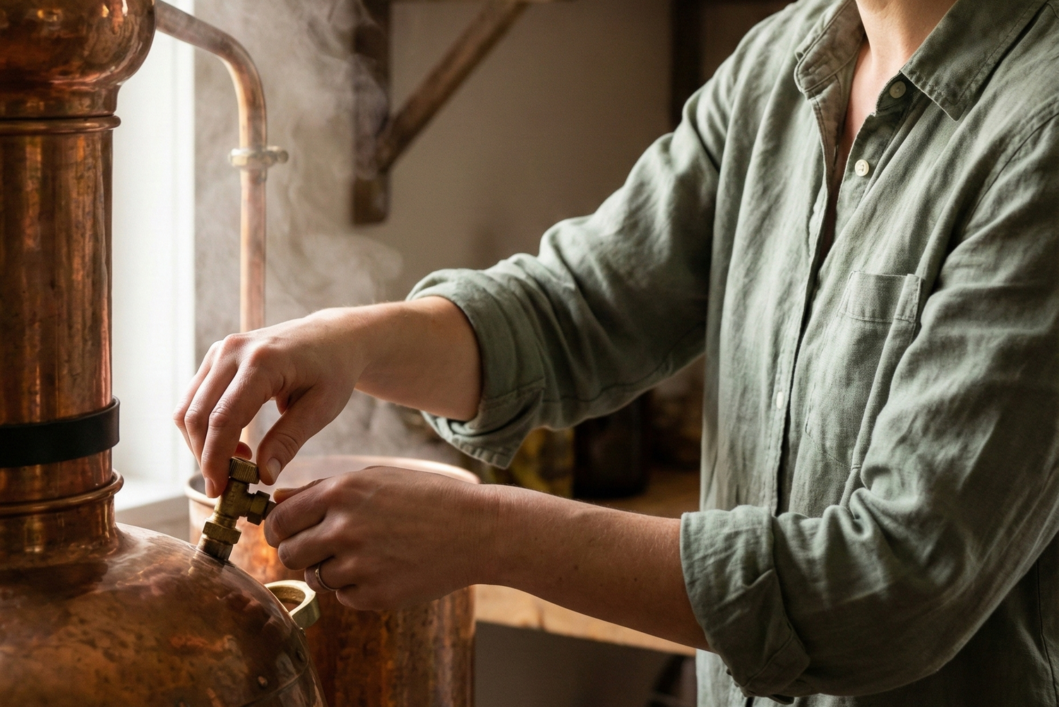 Six hours to extract the oil from a single batch of English lavender (Lavanda angustifolia). Modern stainless steel equipment could do it in a fraction of the time. But faster doesn't mean better. It means cutting corners on temperature, rushing the extraction, losing the delicate top notes that make copper-distilled lavender smell like something you want to breathe in rather than something you
