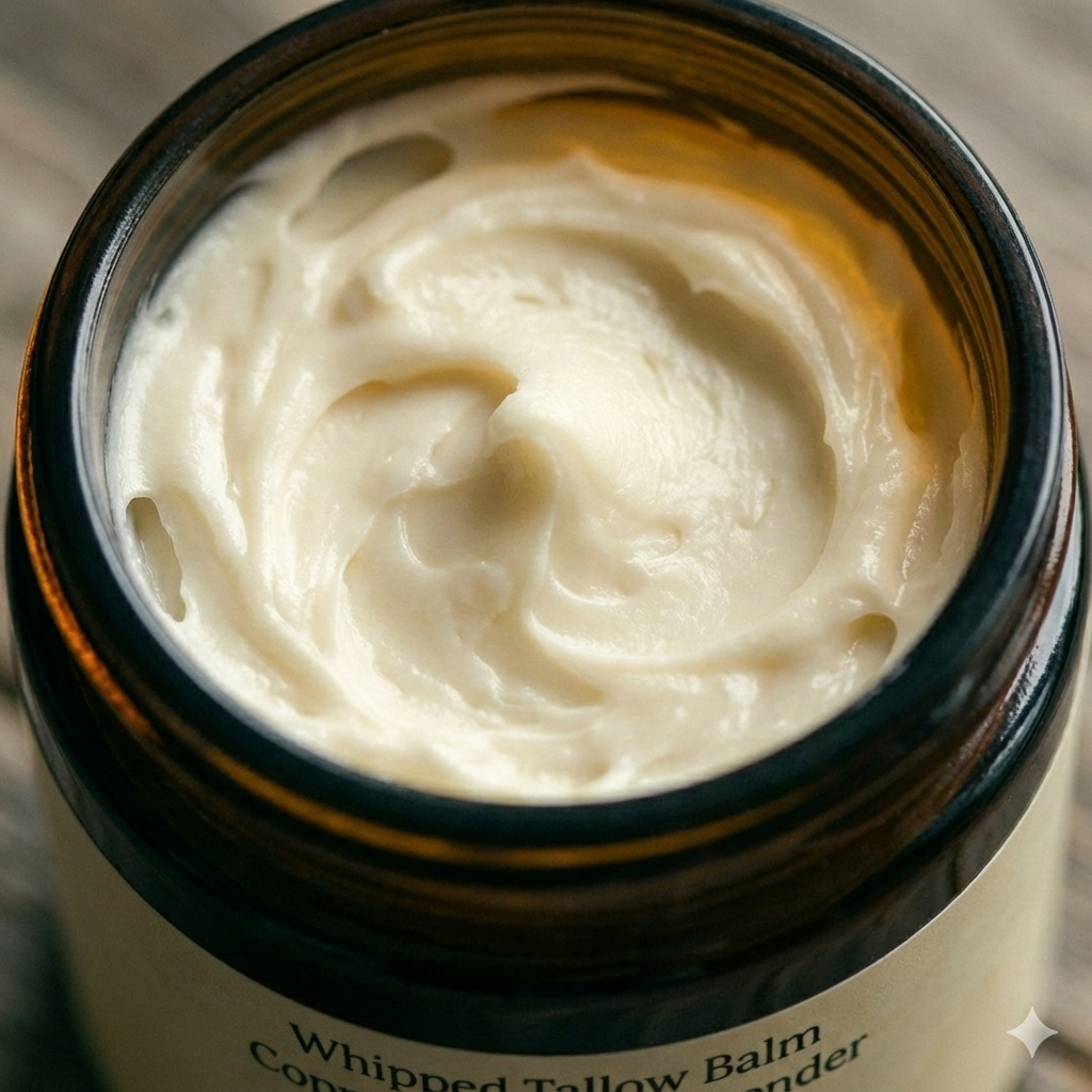 If I wouldn't eat it, I won't put it on your skin. No seed oils. No synthetic fragrances. No ingredients that require a footnote. Our full ingredient list: grass-fed beef tallow, jojoba/almond oil, Vitamin E, arrowroot
